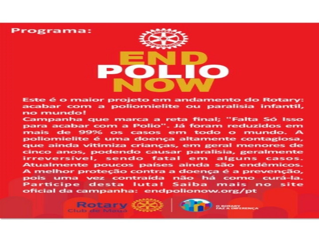 Neste ano a pauta foi a Erradicação da Poliomielite (END POLIO NOW), Projeto do Rotary Internacional onde entregamos panfletos falando sobre o tema, destacando a importância de erradicar a poliomielite no mundo.
